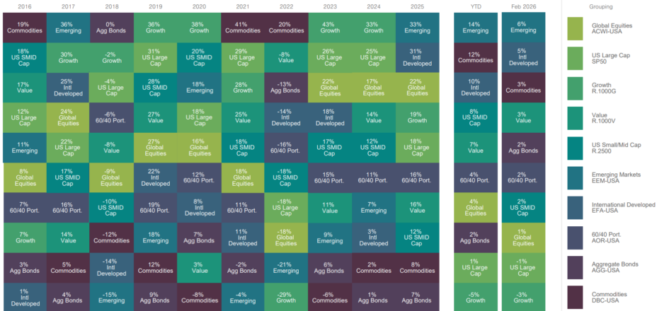 The asset class performance “quilt” included below highlights returns across a range of asset classes over the past 10 years. While leadership shifts meaningfully from year to year, the quilt illustrates how diversified portfolios have historically helped smooth returns over full market cycles.