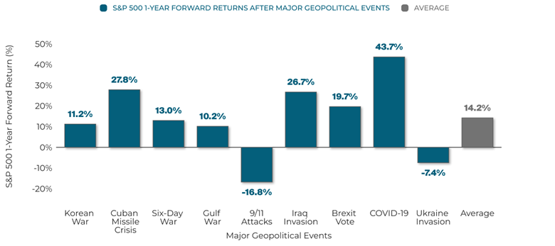 Definitions & Methodology: The S&P 500 tracks the performance of 500 large-cap U.S. companies, serving as a benchmark for the U.S. stock market. The index is weighted by market capitalization. The chart shows the S&P 500 return 1-year after major geopolitical events historically. Returns are price returns. The chart illustrates that geopolitical conflicts, historically, have not deterred the S&P 500 on average. Dates are: Korean War: 06/25/1950, Cuban Missile Crisis: 10/16/1962, Six-Day War: 6/5/1967, Gulf War: 8/2/1990, 9/11 Attacks: 9/11/2001, Iraq Invasion: 3/20/2003, Brexit Vote: 6/24/2016, COVID-19: 3/11/2020, Ukraine Invasion: 2/24/2022.