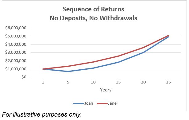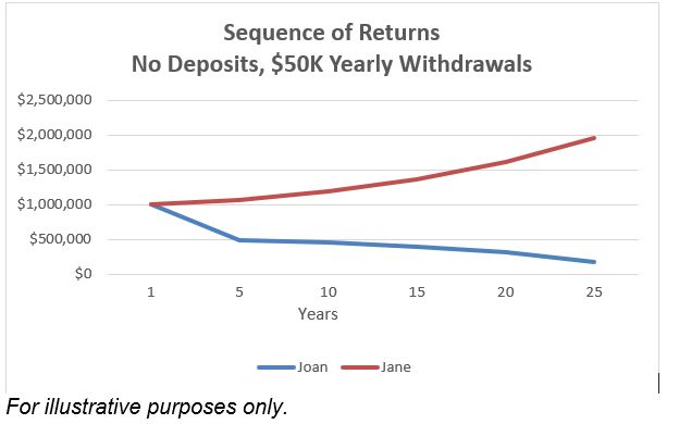 With so much in common, you might assume their portfolios would perform similarly. But what if Joan happens to enter into retirement during a horrible market? Let’s imagine her portfolio returns –30% and –20% in her first two years, while Jane earns 7% both years, and (implausibly) every year thereafter.
