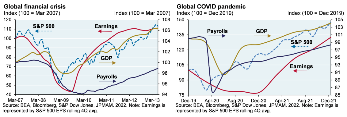 Because the market is an aggregation of future expectations, we pay close attention to price action. Price tends to lead fundamentals (such as earnings, GDP, and employment data), acting as a signal for what the “crowd” sees coming before it shows up in the data. As the chart below shows, during both the Global Financial Crisis and the COVID-19 Pandemic, the S&P 500 bottomed and began to rally well before earnings, GDP, or payrolls recovered. The market anticipates the turn; it does not wait for the “all-clear” signal from economic data.